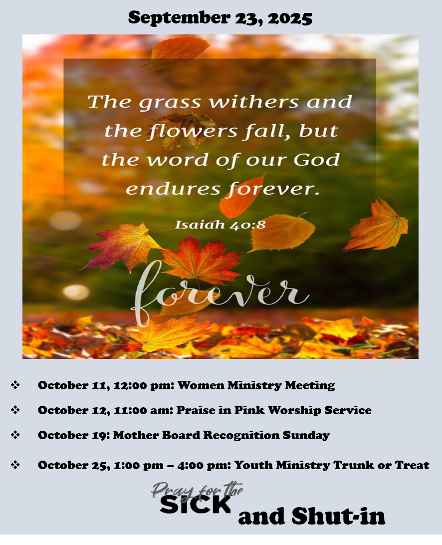 Come worship with us as we Glorify God Together with the aid of the Holy Spirit. Be encouraged and keep the FAITH!